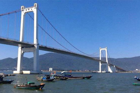 越南峴港順福大橋為三跨連續鋼箱加勁梁懸索橋,主跨405米、全長1856米,...